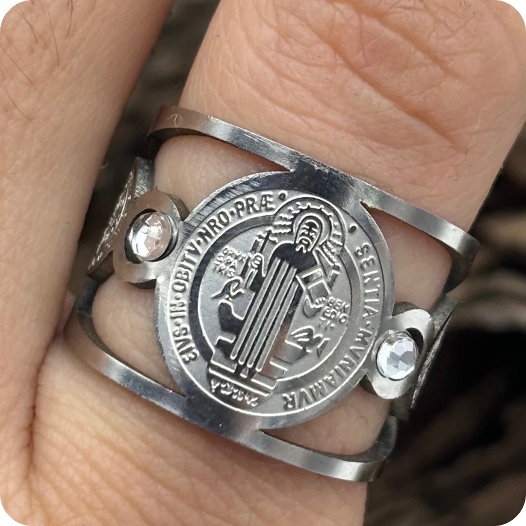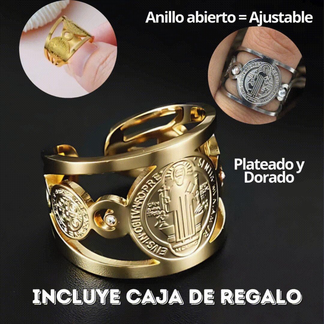"El anillo de San Benito es un poderoso símbolo de protección y fe. Con la cruz y la medalla de San Benito, este anillo actúa como un escudo contra energías negativas, tentaciones y peligros espirituales. Es ideal para quienes buscan fortaleza, bendiciones y la guía divina en su vida diaria.