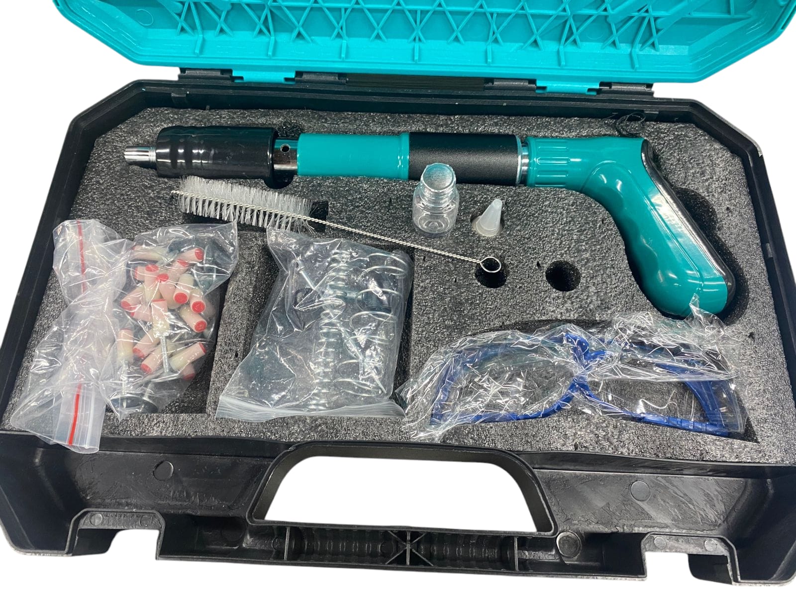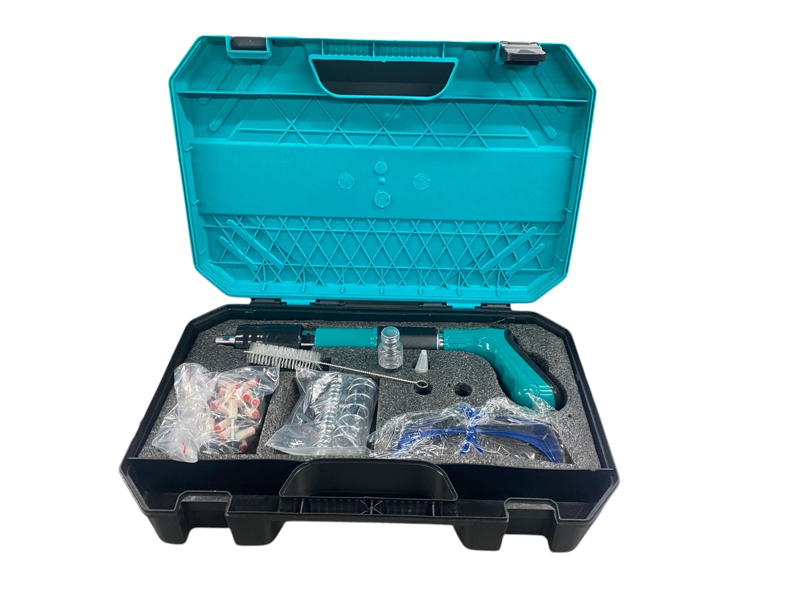 Pistola de Clavos Manual Robusta y ligera, hecha en acero inoxidable y aleación de aluminio Diseño ergonómico y antideslizante Bajo ruido (40 dB) y ecológica Multiusos: madera, concreto, ladrillo, tuberías y más Incluye gafas, repuestos y caja de herramientas Fácil de usar, portátil y práctica para cualquier trabajo.
