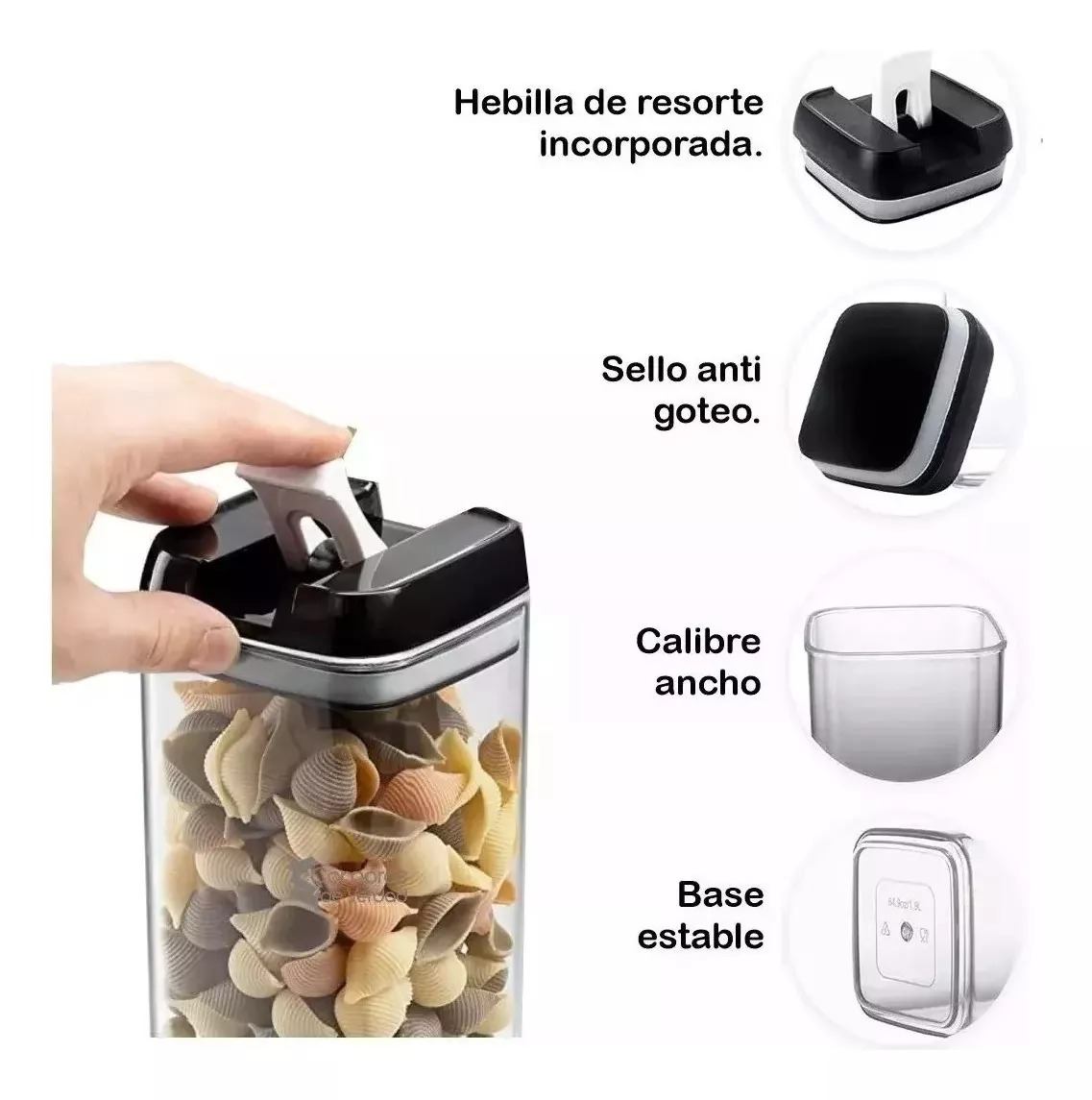 Cada recipiente cuenta con una tapa de sellado hermético que evita la entrada de aire y humedad, asegurando que tus alimentos se mantengan frescos por más tiempo y protegidos contra cualquier contaminación.