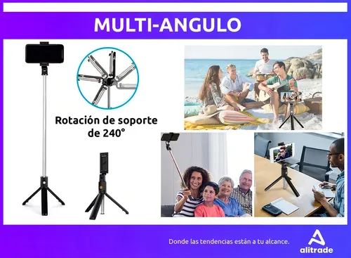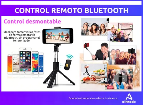 Palo Bastón Selfie con Control Remoto Bluetooth y Trípode para Celular – Color Negro Este selfie stick con trípode integrado posee un diseño simple y elegante. Su estructura innovadora permite abrir el grip y transformarlo fácilmente de bastón selfie a trípode. Incluye un control remoto Bluetooth desmontable, lo que brinda mayor comodidad al momento de capturar fotos o videos. El soporte puede rotar hasta 270°, permitiendo múltiples ángulos de toma. Ideal tanto para fotografía como para filmación: solo debes seleccionar el modo de cámara, presionar el botón y comenzar a capturar. Especificaciones técnicas: Material: Acero inoxidable Compatibilidad: Todos los modelos de celular dentro de las medidas estándar Rotación: Multiángulo con giro de hasta 270° Control remoto Bluetooth desmontable Alcance del control: hasta 10 metros Alimentación: 1 pila tipo reloj CR1632 (no incluida)